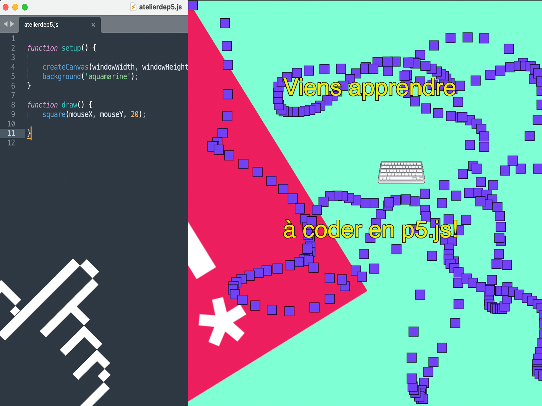 Dans cet atelier, les participant·e·s seront introduit·e·s à la programmation créative avec p5.js. Iels pourront créer leur propre page web interactive et apprendrons les bases de la programmation en Javascript. P5.js est une bibliothèque (une collection de code pré-écrit) JavaScript gratuite et open-source qui permet de créer de l’art, des animations et des interactions directement dans un navigateur web. Inspirée de Processing, elle offre un environnement convivial et accessible aux artistes, designers, débutants et enseignants pour explorer et apprendre la programmation créative, en se concentrant sur l’art génératif et la visualisation de données.